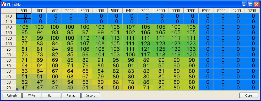 • Open a table lets say VE table. You can see that the new headers use the last header element of the old table and the new cell values are filled with 0.
