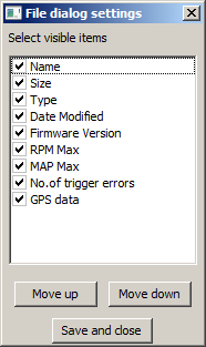 3. The file list. You can order files by name, size, modification date, type, firmware version, maximum value of RPM, maximum value of MAP, the number of trigger errors, and the GPS data (present or not)