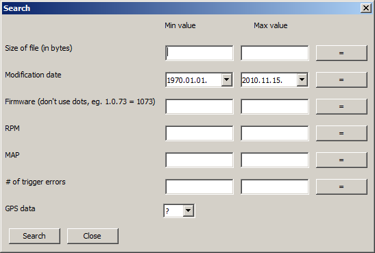 Some properties of the log files can be stored also in the database - the maximum RPM/MAP values, the number of trigger errors and the present of GPS data. To store them, an analysis should be run on the file. This is done automatically in the background if you open the file, or manually if you click on the Analysis button. If VemsTune has calculated the RPM, MAP etc values, it stores them in the database and from this point the file is analyzed.