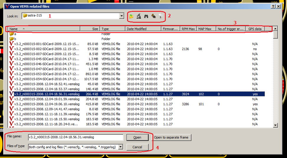 4. The selected file name and the file filter: all VemsTune related files or only config files or only log files or only triggerlog files
